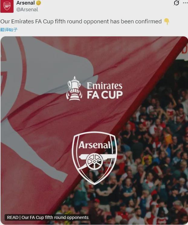 官方:阿森纳在足总杯第五轮抽到了曼斯菲尔德,枪手客场作战。