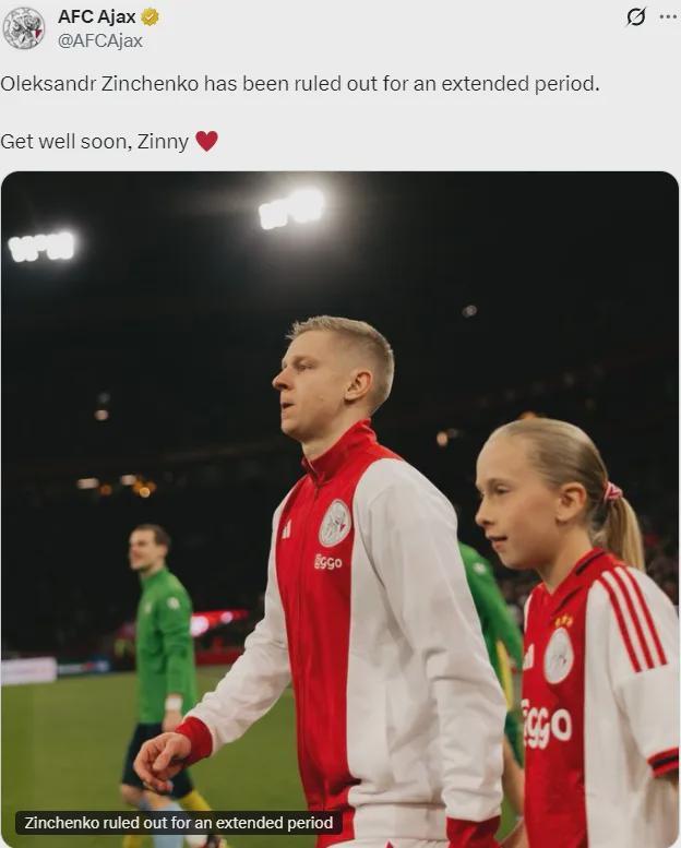 曾官方:阿贾克斯宣布津琴科上场比赛膝盖受伤,经诊断需要接受手术,并且本赛季无法再出战比赛(he will not play again this season)。