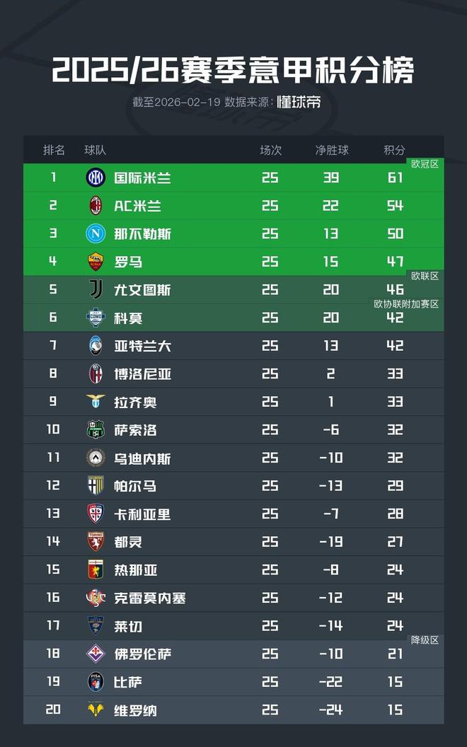 在米兰于第24轮补赛主场1-1战平科莫之后,2025/26赛季意甲联赛已经结束了前25轮的全部比赛。