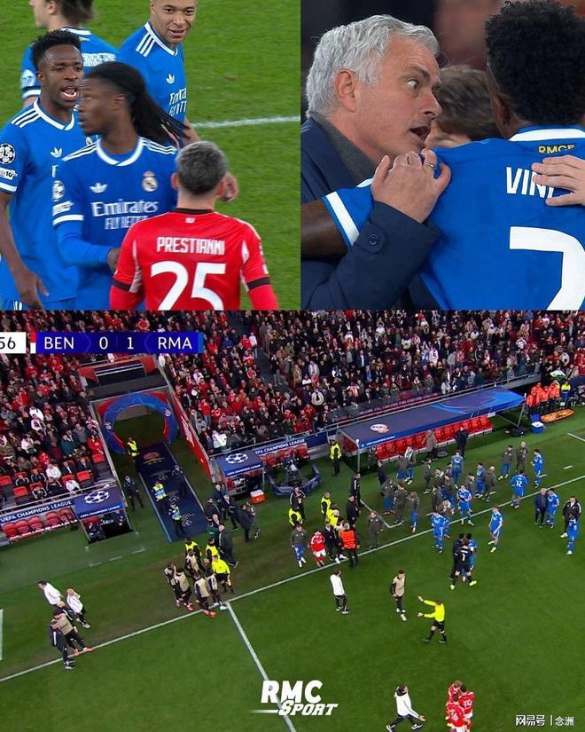 皇马与本菲卡一战成为闹剧,维尼修斯破门投诉普雷斯蒂亚尼种族歧视,裁判暂停比赛,维尼修斯回替补席。第85分钟,穆里尼奥怒斥裁判,连吃两黄被罚下,94分钟本菲卡球迷看台投掷异物击中维尼修斯。